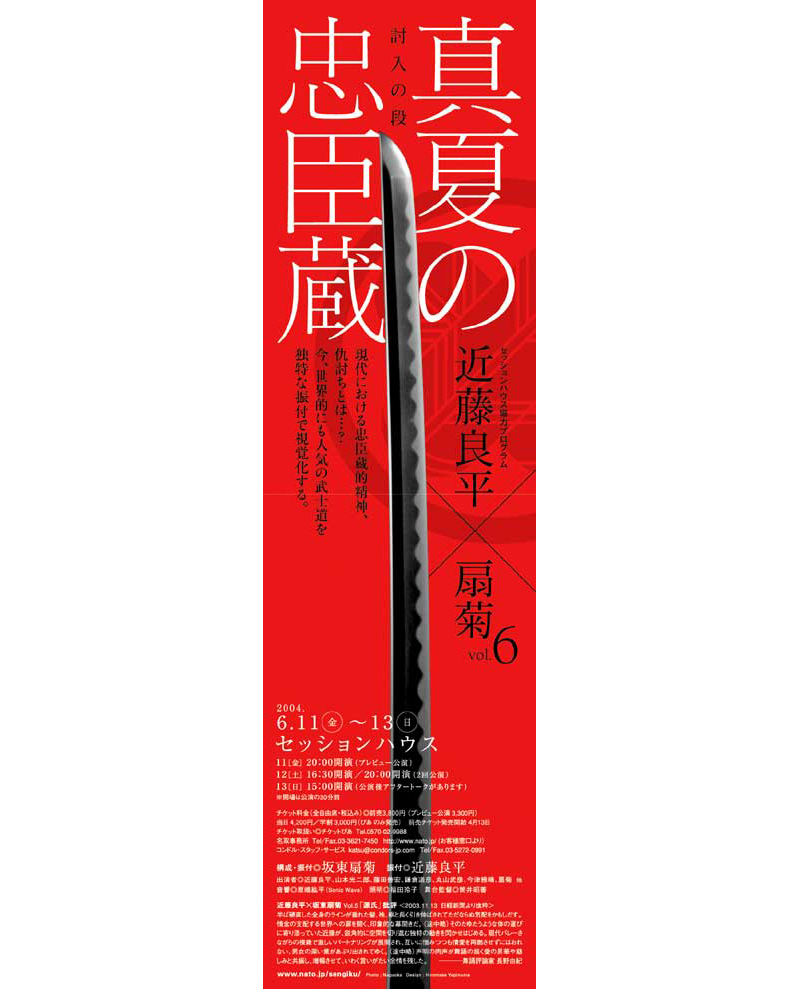<スタッフ> 構成・振付/坂東扇菊 振付/近藤良平 音響/原嶋紘平(Sonic Wave) 照明/福田玲子 宣伝美術/柳沼博雅 舞台監督/筒井昭善 <出演者> 近藤良平 山本光二郎 藤田善宏 鎌倉道彦 丸山武彦 今津雅晴 扇菊 他 at セッションハウス
